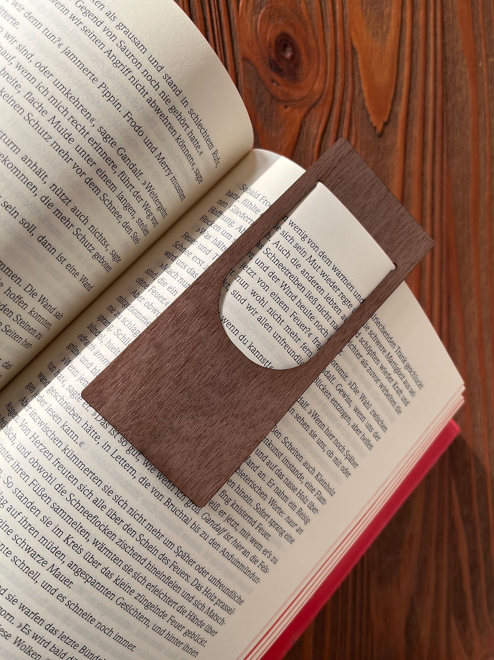 Für unsere Buchzeichen aus 100% Holz verwenden wir Nussbaumfurnier oder Birkenfurnier. Für jede Leseratte das Passende. Oder wir gravieren nach deinem Wunsch.
